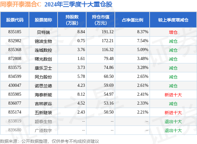 从基金规模来看,同泰开泰混合C基金2024年三季度公布的基金规模为0.14亿元,较上一期规模967.53万元变化了446.84万元,环比变化了46.18%。该基金最新一期资产配置为:股票占净值比88.37%,无债券类资产,现金占净值比4.53%。从基金持仓来看,该基金当季前十大股票仓位达39.97%,第一大重仓股为贝特瑞(835185),持仓占比为8.37%。