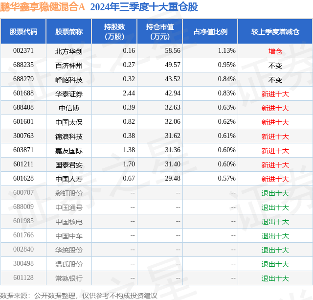从基金规模来看,鹏华鑫享稳健混合A基金2024年三季度公布的基金规模为0.15亿元,较上一期规模1446.43万元变化了29.71万元,环比变化了2.05%。该基金最新一期资产配置为:股票占净值比20.59%,债券占净值比19.54%,现金占净值比21.17%。从基金持仓来看,该基金当季前十大股票仓位达7.38%,第一大重仓股为北方华创(002371),持仓占比为1.13%。
