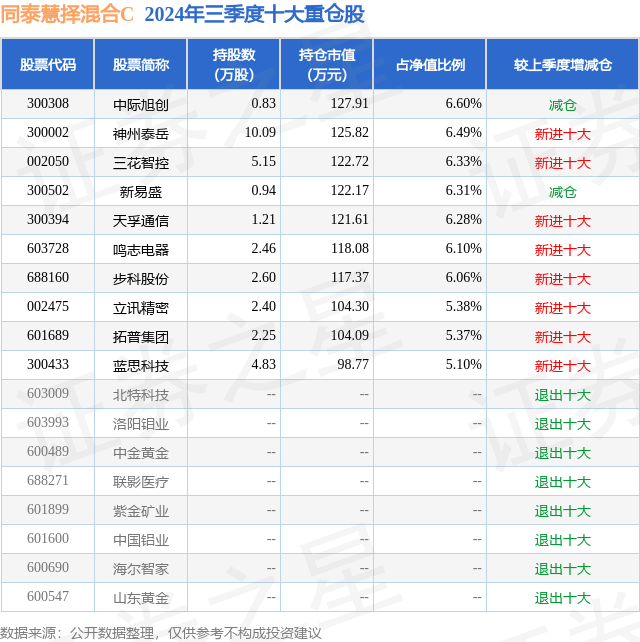 从基金规模来看,同泰慧择混合C基金2024年三季度公布的基金规模为0.06亿元,较上一期规模554.85万元变化了46.25万元,环比变化了8.34%。该基金最新一期资产配置为:股票占净值比93.7%,无债券类资产,现金占净值比2.52%。从基金持仓来看,该基金当季前十大股票仓位达60.02%,第一大重仓股为中际旭创(300308),持仓占比为6.6%。