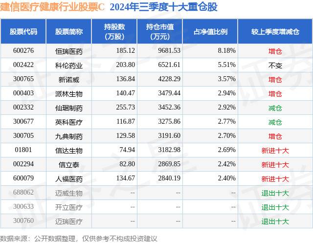 从基金规模来看,建信医疗健康行业股票C基金2024年三季度公布的基金规模为7.03亿元,较上一期规模6.55亿元变化了4750.31万元,环比变化了7.25%。该基金最新一期资产配置为:股票占净值比92.69%,无债券类资产,现金占净值比8.65%。从基金持仓来看,该基金当季前十大股票仓位达36.1%,第一大重仓股为恒瑞医药(600276),持仓占比为8.18%。