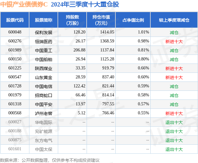 从基金规模来看,中银产业债债券C基金2024年三季度公布的基金规模为0.02亿元,较上一期规模151.32万元变化了10.09万元,环比变化了6.67%。该基金最新一期资产配置为:股票占净值比19.64%,债券占净值比94.46%,现金占净值比1.88%。从基金持仓来看,该基金当季前十大股票仓位达7.15%,第一大重仓股为保利发展(600048),持仓占比为1.01%。