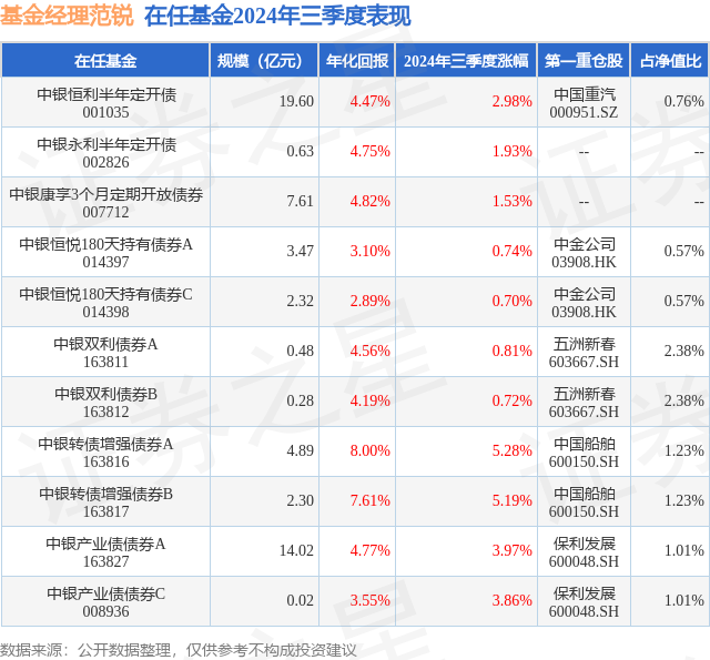 证券之星消息,日前中银产业债债券C基金公布三季报,2024年三季度最新规模0.02亿元,季度净值涨幅为3.86%。