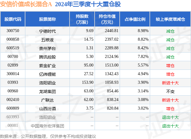 从基金规模来看,安信价值成长混合A基金2024年三季度公布的基金规模为1.88亿元,较上一期规模1.54亿元变化了3338.14万元,环比变化了21.64%。该基金最新一期资产配置为:股票占净值比85.07%,无债券类资产,现金占净值比9.66%。从基金持仓来看,该基金当季前十大股票仓位达57.69%,第一大重仓股为宁德时代(300750),持仓占比为8.98%。