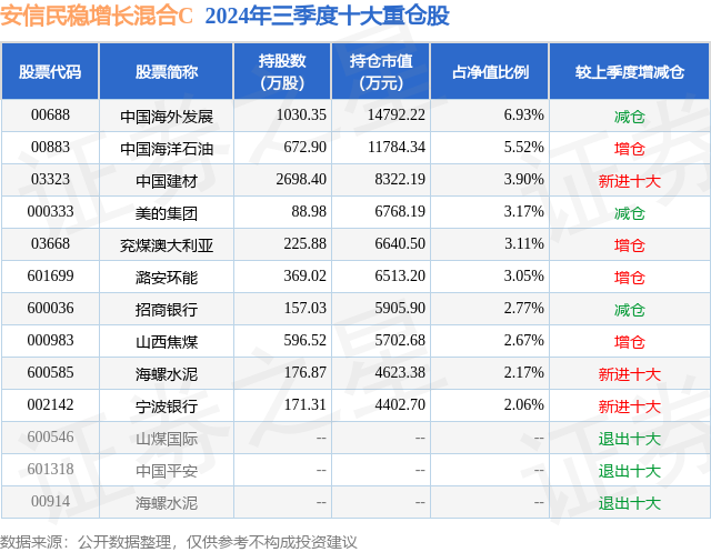 从基金规模来看,安信民稳增长混合C基金2024年三季度公布的基金规模为7.52亿元,较上一期规模6.96亿元变化了5603.43万元,环比变化了8.05%。该基金最新一期资产配置为:股票占净值比47.64%,债券占净值比52.83%,现金占净值比1.5%。从基金持仓来看,该基金当季前十大股票仓位达35.35%,第一大重仓股为中国海外发展(00688),持仓占比为6.93%。