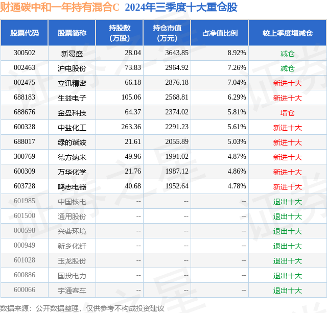 从基金规模来看,财通碳中和一年持有混合C基金2024年三季度公布的基金规模为0.08亿元,较上一期规模832.57万元变化了-26.62万元,环比变化了-3.2%。该基金最新一期资产配置为:股票占净值比94.16%,无债券类资产,现金占净值比8.92%。从基金持仓来看,该基金当季前十大股票仓位达60.47%,第一大重仓股为新易盛(300502),持仓占比为8.92%。