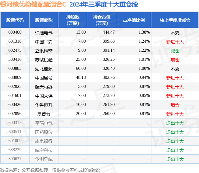证券之星消息,日前银河臻优稳健配置混合C基金公布三季报,2024年三季度最新规模0.0亿元,季度净值涨幅为1.46%。