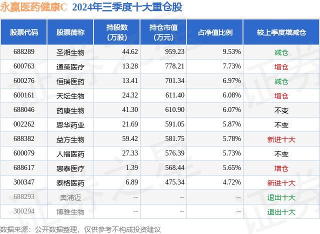 从基金规模来看,永赢医药健康C基金2024年三季度公布的基金规模为0.5亿元,较上一期规模4383.03万元变化了632.96万元,环比变化了14.44%。该基金最新一期资产配置为:股票占净值比82.14%,无债券类资产,现金占净值比16.46%。从基金持仓来看,该基金当季前十大股票仓位达64.13%,第一大重仓股为圣湘生物(688289),持仓占比为9.53%。