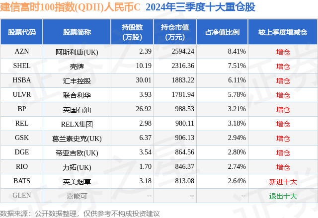 从基金规模来看,建信富时100指数(QDII)人民币C基金2024年三季度公布的基金规模为1.57亿元,较上一期规模1.57亿元变化了-62.85万元,环比变化了-0.4%。该基金最新一期资产配置为:股票占净值比89.54%,无债券类资产,现金占净值比10.45%。从基金持仓来看,该基金当季前十大股票仓位达45.32%,第一大重仓股为阿斯利康(UK)(AZN),持仓占比为8.41%。