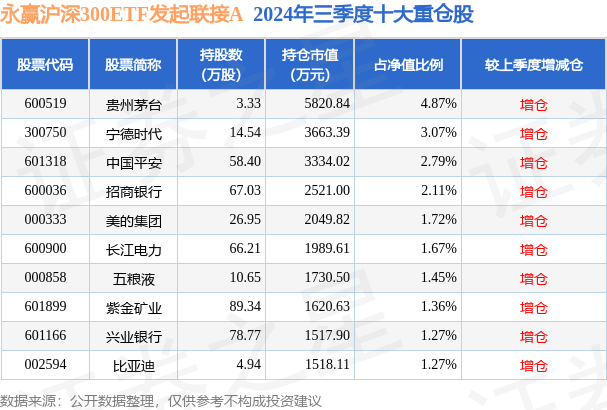 从基金规模来看,永赢沪深300A基金2024年三季度公布的基金规模为9.05亿元,较上一期规模5.02亿元变化了4.03亿元,环比变化了80.38%。该基金最新一期资产配置为:股票占净值比93.09%,债券占净值比1.6%,现金占净值比5.38%。从基金持仓来看,该基金当季前十大股票仓位达21.58%,第一大重仓股为贵州茅台(600519),持仓占比为4.87%。