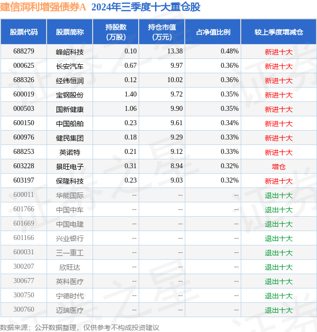 证券之星消息,日前建信润利增强债券A基金公布三季报,2024年三季度最新规模0.19亿元,季度净值涨幅为2.8%。