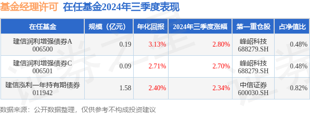 建信润利增强债券C现任基金经理为许可。其中在任基金经理许可已从业1年又260天,2024年10月14日正式接手管理建信润利增强债券C,任职期间累计回报为0.13%。目前还管理着3只基金产品(包括A类和C类),其中本季度表现最佳的基金为建信润利增强债券A(006500),季度净值涨幅为2.8%。
