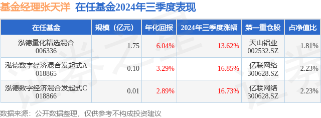 证券之星消息,日前泓德量化精选混合基金公布三季报,2024年三季度最新规模1.75亿元,季度净值涨幅为13.62%。