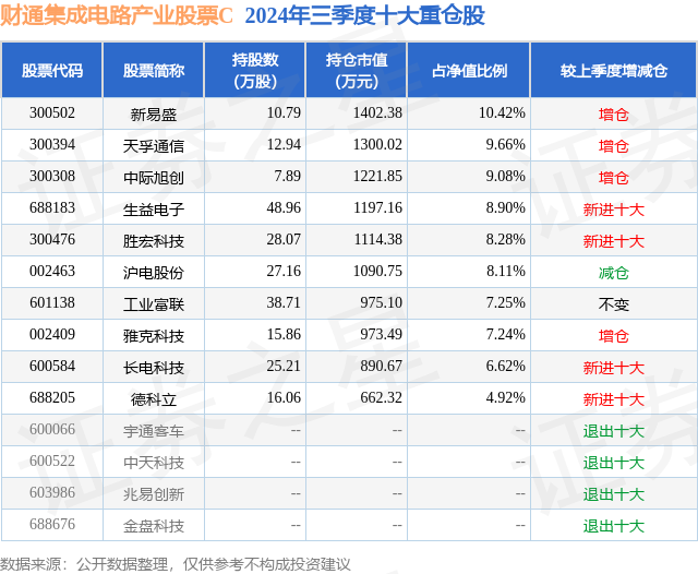 从基金规模来看,财通集成电路产业股票C基金2024年三季度公布的基金规模为0.71亿元,较上一期规模5367.66万元变化了1728.15万元,环比变化了32.2%。该基金最新一期资产配置为:股票占净值比89.68%,无债券类资产,现金占净值比14.72%。从基金持仓来看,该基金当季前十大股票仓位达80.48%,第一大重仓股为新易盛(300502),持仓占比为10.42%。