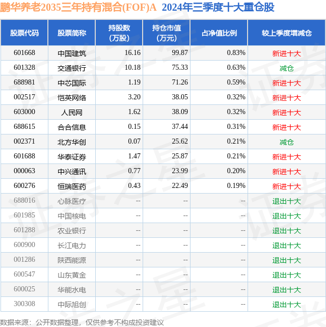 从基金规模来看,鹏华养老2035三年持有混合(FOF)A基金2024年三季度公布的基金规模为1.05亿元,较上一期规模1.03亿元变化了262.82万元,环比变化了2.56%。该基金最新一期资产配置为:股票占净值比5.04%,无债券类资产,现金占净值比5.57%。从基金持仓来看,该基金当季前十大股票仓位达3.81%,第一大重仓股为中国建筑(601668),持仓占比为0.83%。