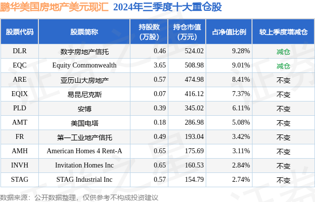 从基金规模来看,鹏华美国房地产美元现汇基金2024年三季度公布的基金规模为0.56亿元,较上一期规模5181.81万元变化了464.26万元,环比变化了8.96%。该基金最新一期资产配置为:股票占净值比1.15%,无债券类资产,现金占净值比38.3%。从基金持仓来看,该基金当季前十大股票仓位达57.37%,第一大重仓股为数字房地产信托(DLR),持仓占比为9.28%。