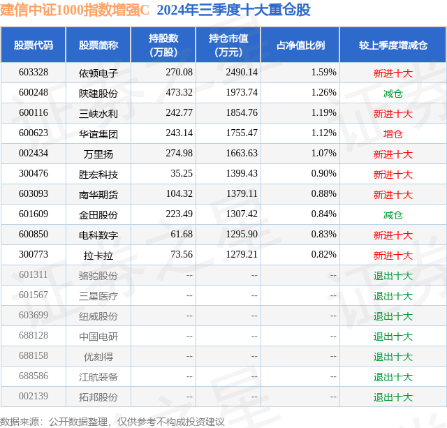 从基金规模来看,建信中证1000指数增强C基金2024年三季度公布的基金规模为6.14亿元,较上一期规模5.12亿元变化了1.02亿元,环比变化了19.88%。该基金最新一期资产配置为:股票占净值比88.73%,无债券类资产,现金占净值比11.48%。从基金持仓来看,该基金当季前十大股票仓位达10.5%,第一大重仓股为依顿电子(603328),持仓占比为1.59%。