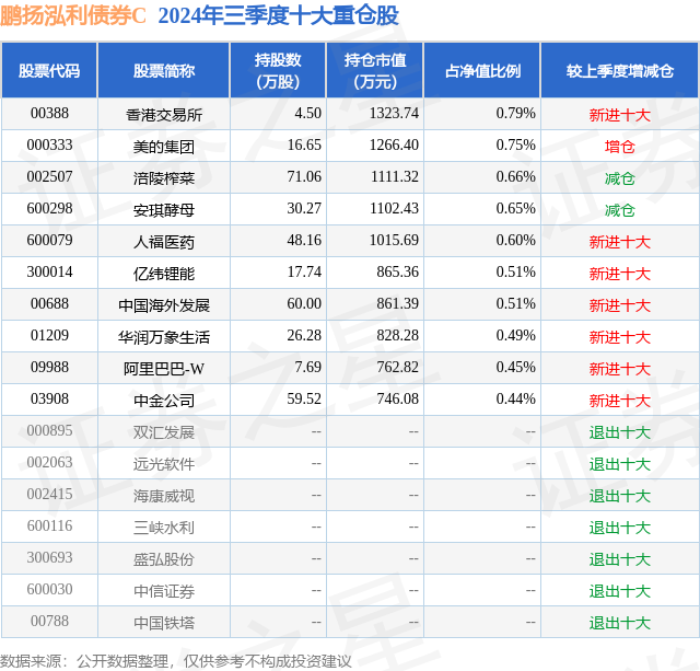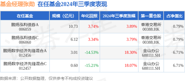 从基金规模来看,鹏扬泓利债券C基金2024年三季度公布的基金规模为6.12亿元,较上一期规模6.4亿元变化了-2732.03万元,环比变化了-4.27%。该基金最新一期资产配置为:股票占净值比14.4%,债券占净值比109.03%,现金占净值比7.93%。从基金持仓来看,该基金当季前十大股票仓位达5.85%,第一大重仓股为香港交易所(00388),持仓占比为0.79%。