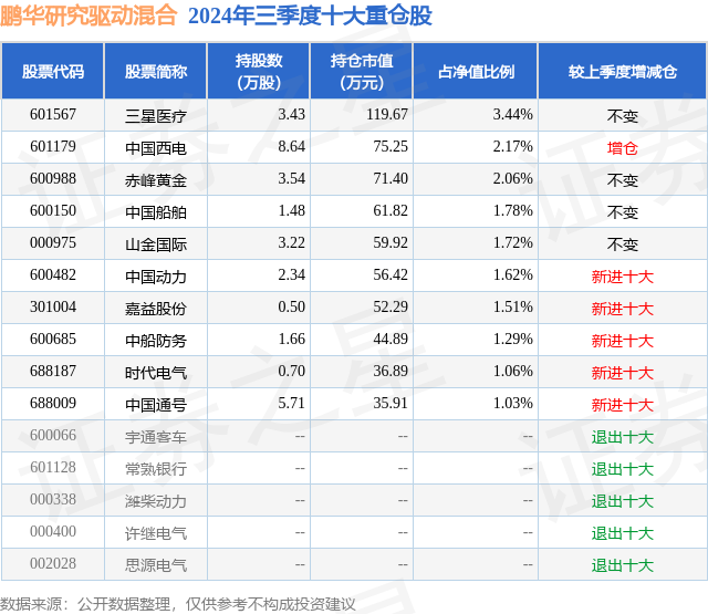 从基金规模来看,鹏华研究驱动混合基金2024年三季度公布的基金规模为0.35亿元,较上一期规模3389.17万元变化了85.2万元,环比变化了2.51%。该基金最新一期资产配置为:股票占净值比81.45%,无债券类资产,现金占净值比19.13%。从基金持仓来看,该基金当季前十大股票仓位达17.68%,第一大重仓股为三星医疗(601567),持仓占比为3.44%。
