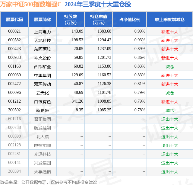 从基金规模来看,万家中证500指数增强C基金2024年三季度公布的基金规模为5.47亿元,较上一期规模5.66亿元变化了-1898.68万元,环比变化了-3.35%。该基金最新一期资产配置为:股票占净值比93.91%,无债券类资产,现金占净值比5.93%。从基金持仓来看,该基金当季前十大股票仓位达8.5%,第一大重仓股为上海电力(600021),持仓占比为0.99%。