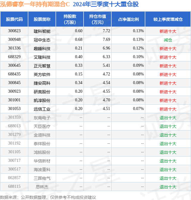 从基金规模来看,泓德睿享一年持有期混合C基金2024年三季度公布的基金规模为0.06亿元,较上一期规模553.17万元变化了27.68万元,环比变化了5.0%。该基金最新一期资产配置为:股票占净值比12.38%,债券占净值比99.54%,现金占净值比2.31%。从基金持仓来看,该基金当季前十大股票仓位达0.96%,第一大重仓股为建科智能(300823),持仓占比为0.13%。
