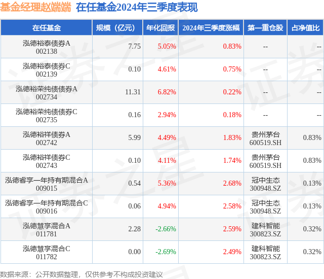 泓德睿享一年持有期混合C现任基金经理为赵端端 姚学康。其中在任基金经理赵端端已从业6年又33天,2020年6月24日正式接手管理泓德睿享一年持有期混合C,任职期间累计回报为23.26%。目前还管理着10只基金产品(包括A类和C类),其中本季度表现最佳的基金为泓德睿享一年持有期混合A(009015),季度净值涨幅为2.68%。