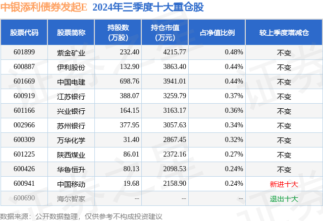 从基金规模来看,中银添利债券发起E基金2024年三季度公布的基金规模为27.22亿元,较上一期规模35.04亿元变化了-7.83亿元,环比变化了-22.34%。该基金最新一期资产配置为:股票占净值比4.37%,债券占净值比116.2%,现金占净值比2.17%。从基金持仓来看,该基金当季前十大股票仓位达3.5%,第一大重仓股为紫金矿业(601899),持仓占比为0.48%。