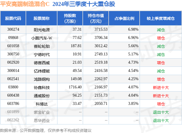 从基金规模来看,平安高端制造混合C基金2024年三季度公布的基金规模为2.07亿元,较上一期规模1.76亿元变化了3095.95万元,环比变化了17.61%。该基金最新一期资产配置为:股票占净值比89.34%,无债券类资产,现金占净值比5.8%。从基金持仓来看,该基金当季前十大股票仓位达50.25%,第一大重仓股为阳光电源(300274),持仓占比为6.98%。