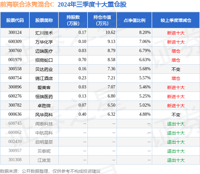 从基金规模来看,前海联合泳隽混合C基金2024年三季度公布的基金规模为0.0亿元,较上一期规模39.39万元变化了4.36万元,环比变化了11.06%。该基金最新一期资产配置为:股票占净值比93.31%,无债券类资产,现金占净值比8.24%。从基金持仓来看,该基金当季前十大股票仓位达60.54%,第一大重仓股为汇川技术(300124),持仓占比为8.2%。
