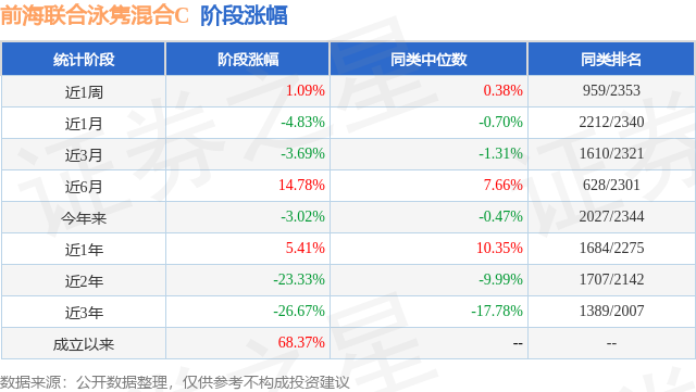从业绩表现来看,前海联合泳隽混合C基金过去一年净值涨幅为-6.02%,在同类基金中排名2049/2261,同类基金过去一年净值涨幅中位数为5.1%。而基金过去一年的最大回撤为-34.62%,成立以来的最大回撤为-45.36%。