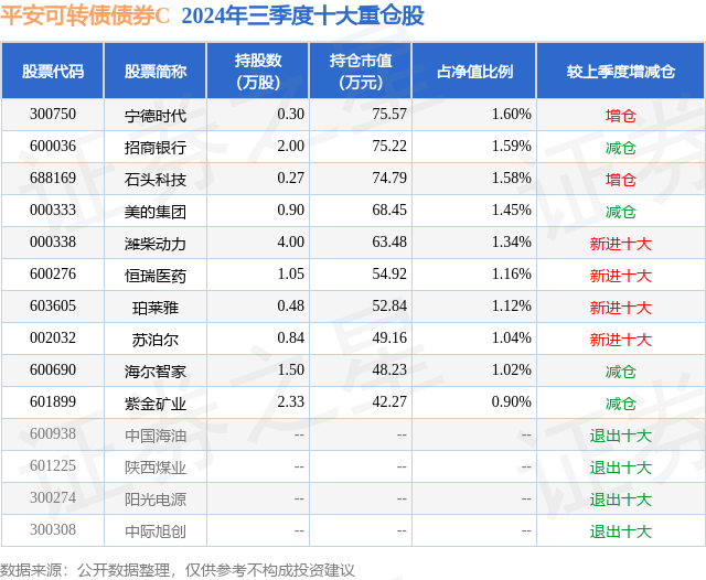 从基金规模来看,平安可转债债券C基金2024年三季度公布的基金规模为0.22亿元,较上一期规模2279.2万元变化了-70.43万元,环比变化了-3.09%。该基金最新一期资产配置为:股票占净值比16.51%,债券占净值比116.1%,现金占净值比3.47%。从基金持仓来看,该基金当季前十大股票仓位达12.8%,第一大重仓股为宁德时代(300750),持仓占比为1.6%。