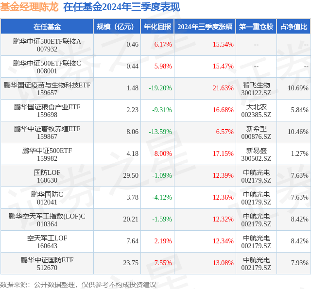 从基金规模来看,鹏华空天军工指数(LOF)C基金2024年三季度公布的基金规模为20.21亿元,较上一期规模17.72亿元变化了2.49亿元,环比变化了14.08%。该基金最新一期资产配置为:股票占净值比94.16%,无债券类资产,现金占净值比5.45%。从基金持仓来看,该基金当季前十大股票仓位达51.3%,第一大重仓股为中航光电(002179),持仓占比为8.42%。