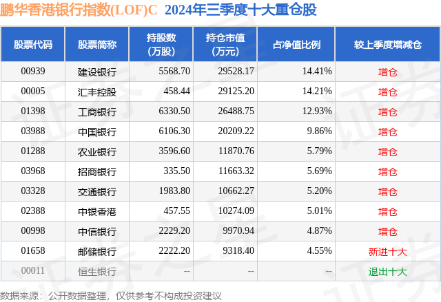 从基金规模来看,鹏华香港银行指数(LOF)C基金2024年三季度公布的基金规模为18.8亿元,较上一期规模9.98亿元变化了8.82亿元,环比变化了88.34%。该基金最新一期资产配置为:股票占净值比94.08%,无债券类资产,现金占净值比8.3%。从基金持仓来看,该基金当季前十大股票仓位达82.52%,第一大重仓股为建设银行(00939),持仓占比为14.41%。