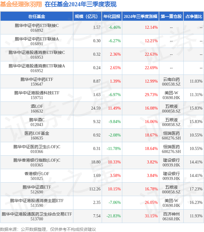 鹏华香港银行指数(LOF)C现任基金经理为张羽翔。其中在任基金经理张羽翔已从业9年又42天,2020年10月27日正式接手管理鹏华香港银行指数(LOF)C,任职期间累计回报为48.12%。目前还管理着15只基金产品(包括A类和C类),其中本季度表现最佳的基金为鹏华中证港股通医药卫生综合交易ETF(513700),季度净值涨幅为31.15%。