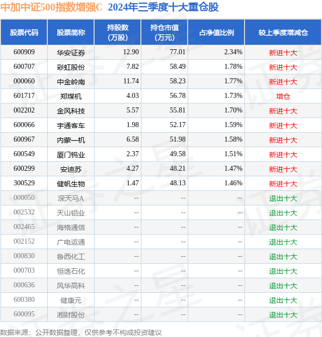 从基金规模来看,中加中证500指数增强C基金2024年三季度公布的基金规模为0.22亿元,较上一期规模1332.16万元变化了827.81万元,环比变化了62.14%。该基金最新一期资产配置为:股票占净值比90.83%,无债券类资产,现金占净值比5.76%。从基金持仓来看,该基金当季前十大股票仓位达16.93%,第一大重仓股为华安证券(600909),持仓占比为2.34%。