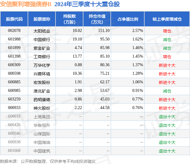 从基金规模来看,安信聚利增强债券B基金2024年三季度公布的基金规模为0.0亿元,较上一期规模nan万元变化了nan万元,环比变化了nan%。该基金最新一期资产配置为:股票占净值比19.0%,债券占净值比84.33%,现金占净值比7.08%。从基金持仓来看,该基金当季前十大股票仓位达13.25%,第一大重仓股为太阳纸业(002078),持仓占比为2.57%。
