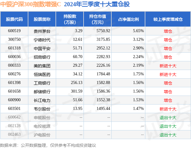 从基金规模来看,中银沪深300指数增强C基金2024年三季度公布的基金规模为5.8亿元,较上一期规模2.21亿元变化了3.6亿元,环比变化了162.99%。该基金最新一期资产配置为:股票占净值比94.01%,无债券类资产,现金占净值比5.71%。从基金持仓来看,该基金当季前十大股票仓位达23.97%,第一大重仓股为贵州茅台(600519),持仓占比为5.65%。