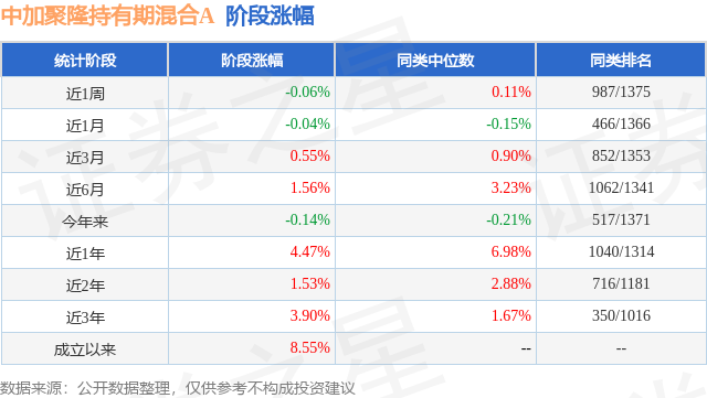 从业绩表现来看,中加聚隆持有期混合A基金过去一年净值涨幅为4.98%,在同类基金中排名521/1322,同类基金过去一年净值涨幅中位数为4.43%。而基金过去一年的最大回撤为-1.24%,成立以来的最大回撤为-2.79%。