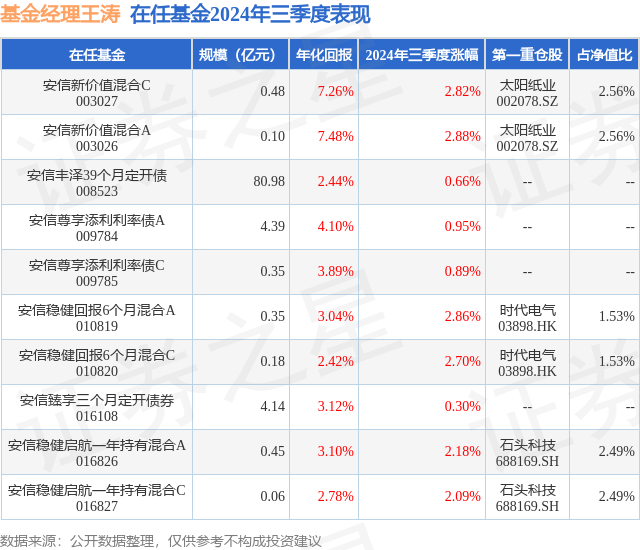 安信稳健回报6个月混合A现任基金经理为王涛 柴迪伊 朱舟扬。其中在任基金经理王涛已从业8年又168天,2022年5月20日正式接手管理安信稳健回报6个月混合A,任职期间累计回报为9.54%。目前还管理着10只基金产品(包括A类和C类),其中本季度表现最佳的基金为安信新价值混合A(003026),季度净值涨幅为2.88%。