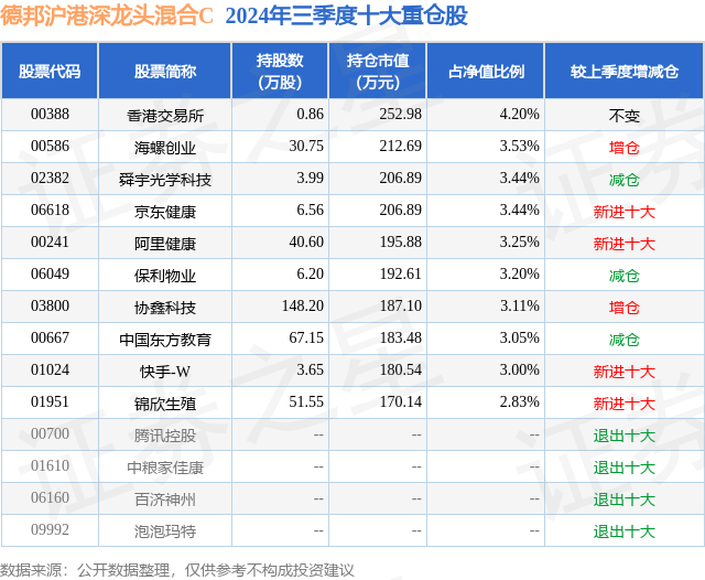 从基金规模来看,德邦沪港深龙头混合C基金2024年三季度公布的基金规模为0.19亿元,较上一期规模1658.97万元变化了288.6万元,环比变化了17.4%。该基金最新一期资产配置为:股票占净值比91.34%,无债券类资产,现金占净值比8.8%。从基金持仓来看,该基金当季前十大股票仓位达33.05%,第一大重仓股为香港交易所(00388),持仓占比为4.2%。