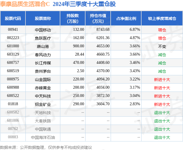 从基金规模来看,泰康品质生活混合C基金2024年三季度公布的基金规模为4.03亿元,较上一期规模3.66亿元变化了3698.88万元,环比变化了10.1%。该基金最新一期资产配置为:股票占净值比81.75%,无债券类资产,现金占净值比8.83%。从基金持仓来看,该基金当季前十大股票仓位达38.21%,第一大重仓股为中国移动(00941),持仓占比为6.87%。