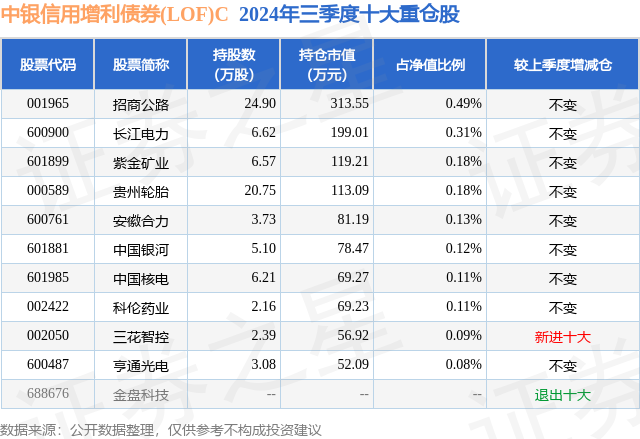 从基金规模来看,中银信用增利债券(LOF)C基金2024年三季度公布的基金规模为0.49亿元,较上一期规模5908.27万元变化了-1057.28万元,环比变化了-17.89%。该基金最新一期资产配置为:股票占净值比1.99%,债券占净值比129.51%,现金占净值比2.27%。从基金持仓来看,该基金当季前十大股票仓位达1.8%,第一大重仓股为招商公路(001965),持仓占比为0.49%。