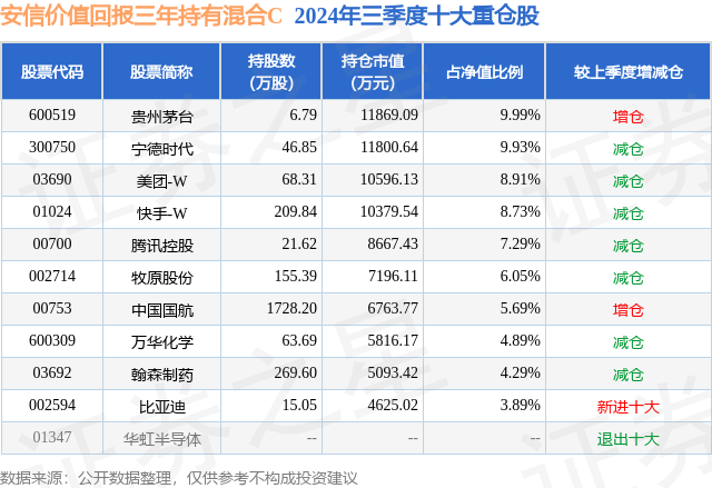 从基金规模来看,安信价值回报三年持有混合C基金2024年三季度公布的基金规模为0.03亿元,较上一期规模230.74万元变化了39.72万元,环比变化了17.21%。该基金最新一期资产配置为:股票占净值比91.58%,债券占净值比4.88%,现金占净值比3.78%。从基金持仓来看,该基金当季前十大股票仓位达69.66%,第一大重仓股为贵州茅台(600519),持仓占比为9.99%。