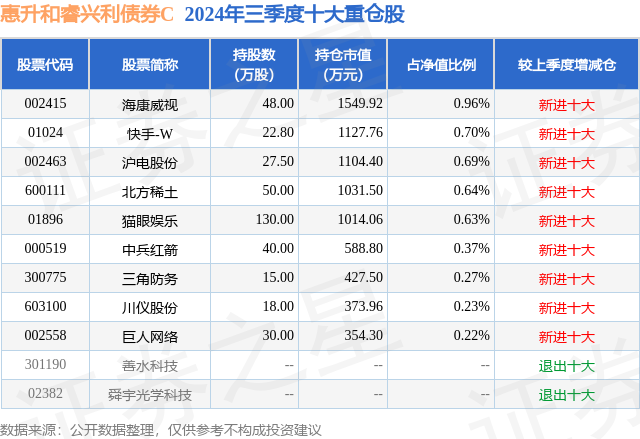 从基金规模来看,惠升和睿兴利债券C基金2024年三季度公布的基金规模为15.26亿元,较上一期规模1390.01万元变化了15.12亿元,环比变化了10876.17%。该基金最新一期资产配置为:股票占净值比4.71%,债券占净值比62.01%,现金占净值比3.22%。从基金持仓来看,该基金当季前十大股票仓位达4.71%,第一大重仓股为海康威视(002415),持仓占比为0.96%。