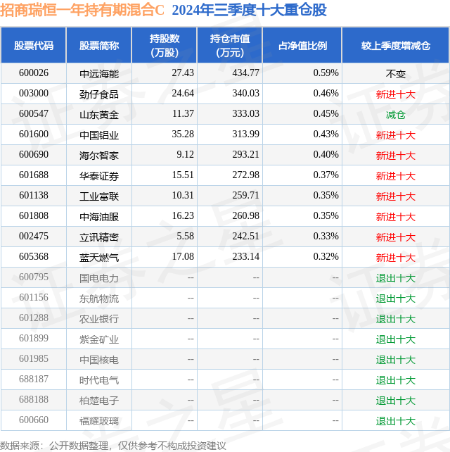 从基金规模来看,招商瑞恒一年持有期混合C基金2024年三季度公布的基金规模为3.45亿元,较上一期规模3.98亿元变化了-5327.0万元,环比变化了-13.38%。该基金最新一期资产配置为:股票占净值比7.22%,债券占净值比87.63%,现金占净值比1.64%。从基金持仓来看,该基金当季前十大股票仓位达4.05%,第一大重仓股为中远海能(600026),持仓占比为0.59%。