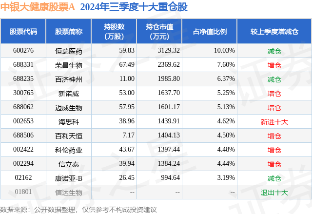 从基金规模来看,中银大健康股票A基金2024年三季度公布的基金规模为2.78亿元,较上一期规模2.39亿元变化了3932.69万元,环比变化了16.47%。该基金最新一期资产配置为:股票占净值比94.19%,债券占净值比5.24%,现金占净值比0.62%。从基金持仓来看,该基金当季前十大股票仓位达55.61%,第一大重仓股为恒瑞医药(600276),持仓占比为10.03%。