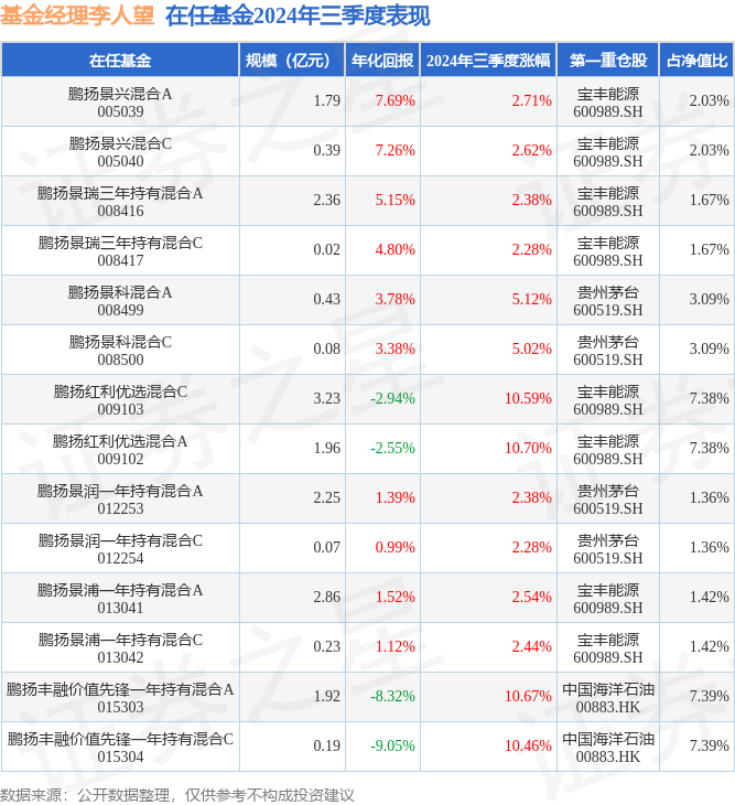 证券之星消息,日前鹏扬红利优选混合C基金公布三季报,2024年三季度最新规模3.23亿元,季度净值涨幅为10.59%。
