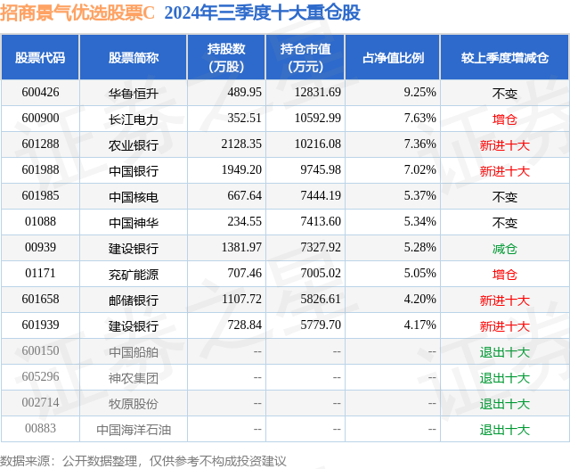从基金规模来看,招商景气优选股票C基金2024年三季度公布的基金规模为3.75亿元,较上一期规模3.97亿元变化了-2217.34万元,环比变化了-5.59%。该基金最新一期资产配置为:股票占净值比81.79%,无债券类资产,现金占净值比8.24%。从基金持仓来看,该基金当季前十大股票仓位达60.67%,第一大重仓股为华鲁恒升(600426),持仓占比为9.25%。