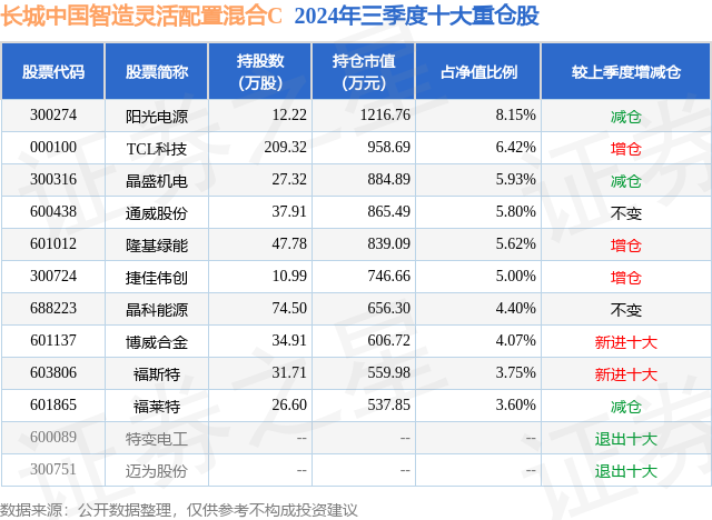 从基金规模来看,长城中国智造灵活配置混合C基金2024年三季度公布的基金规模为0.18亿元,较上一期规模1623.71万元变化了142.35万元,环比变化了8.77%。该基金最新一期资产配置为:股票占净值比91.03%,债券占净值比3.9%,现金占净值比1.35%。从基金持仓来看,该基金当季前十大股票仓位达52.74%,第一大重仓股为阳光电源(300274),持仓占比为8.15%。