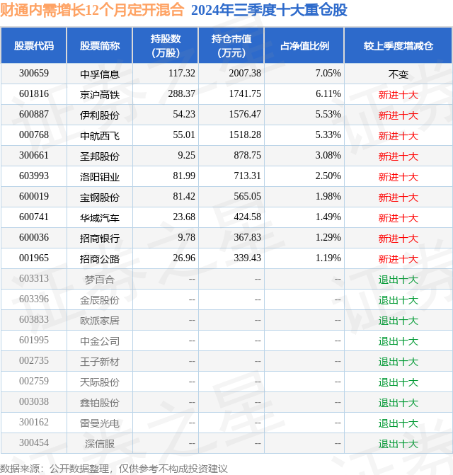从基金规模来看,财通内需增长12个月定开混合基金2024年三季度公布的基金规模为2.85亿元,较上一期规模2.85亿元变化了29.46万元,环比变化了0.1%。该基金最新一期资产配置为:股票占净值比75.24%,无债券类资产,现金占净值比9.95%。从基金持仓来看,该基金当季前十大股票仓位达35.55%,第一大重仓股为中孚信息(300659),持仓占比为7.05%。