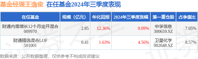 证券之星消息,日前财通内需增长12个月定开混合基金公布三季报,2024年三季度最新规模2.85亿元,季度净值涨幅为0.09%。